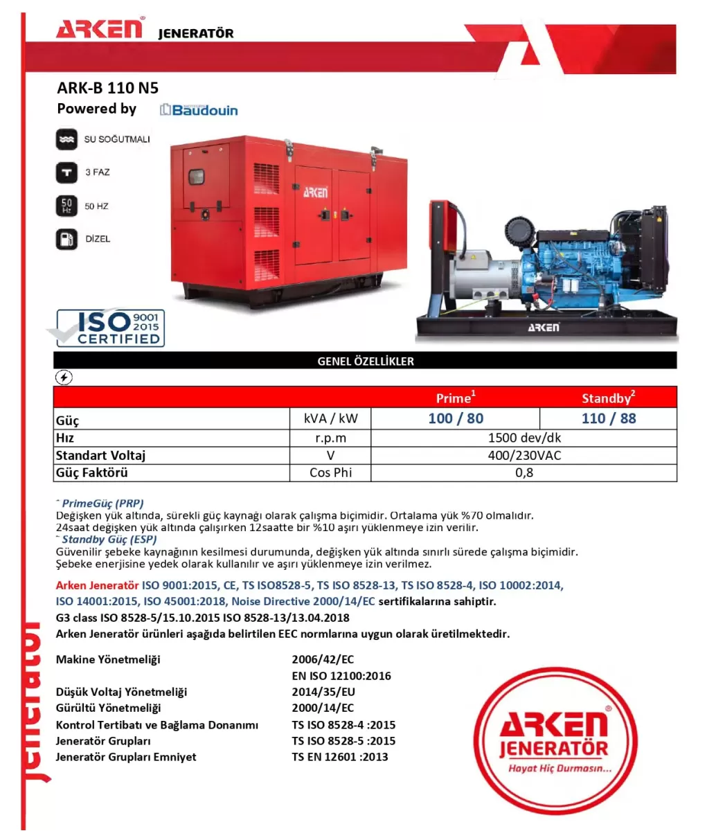 Arken Jeneratör, ISO 8528, ISO 3046 spesifikasyonlarını karşılayan sadece ağır hizmet tipi, düşük yakıt sarfiyatlı, hassas hız ayarı ve regülasyonu sağlayan yakıt pompasına monteli mekanik veya elektronik tip governörlü, dizel soğutma tipine göre yağ, hava veya su soğutmalı, dizelin uzun ömürlü veya yüksek performanslı çalışmasını sağlayan ağır çalışma şartlarına göre dizayn edilmiş yağ, yakıt ve hava filtre sistemi, dizel korumaları için gerekli sınır ve seviye sensörlerine sahip, 4 zamanlı, direk enjeksiyonlu endüstriyel tip dizel motorlar kullanılmaktadır. Dizel motor, güvenli bir şekilde çalışması için gerekli olan tüm donanımlarla birlikte verilmiştir. Piyasalarda sadece Standby çalşıma için dizayn edilmiş motorlar üretim portföyünde yer almamaktadır